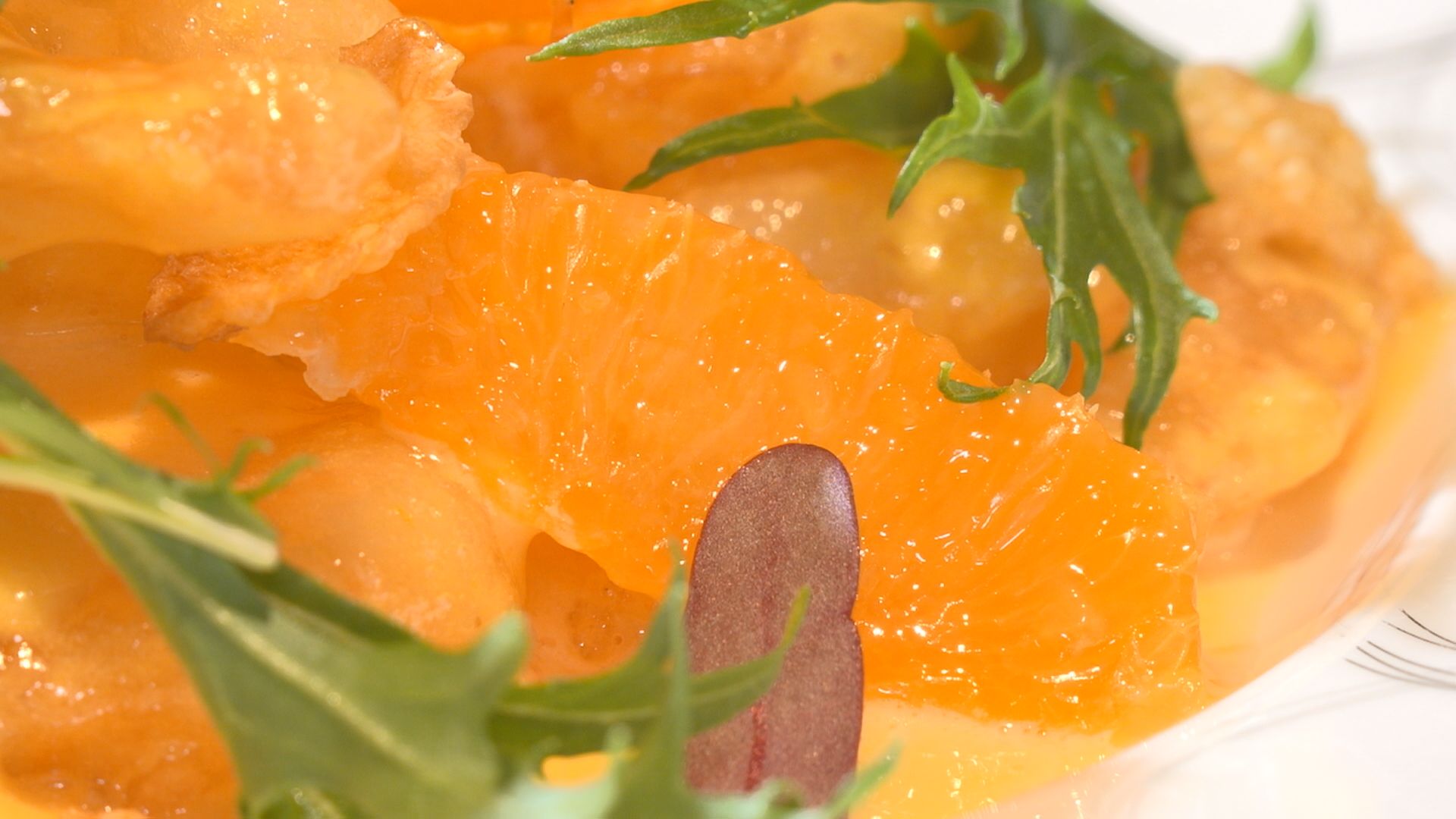 ※ポイント:皮の内側の白い部分は取り除く(柑橘特有の苦みを取るため) - 果肉は、包丁で薄皮から外し、ソース用と盛り付け用に分ける